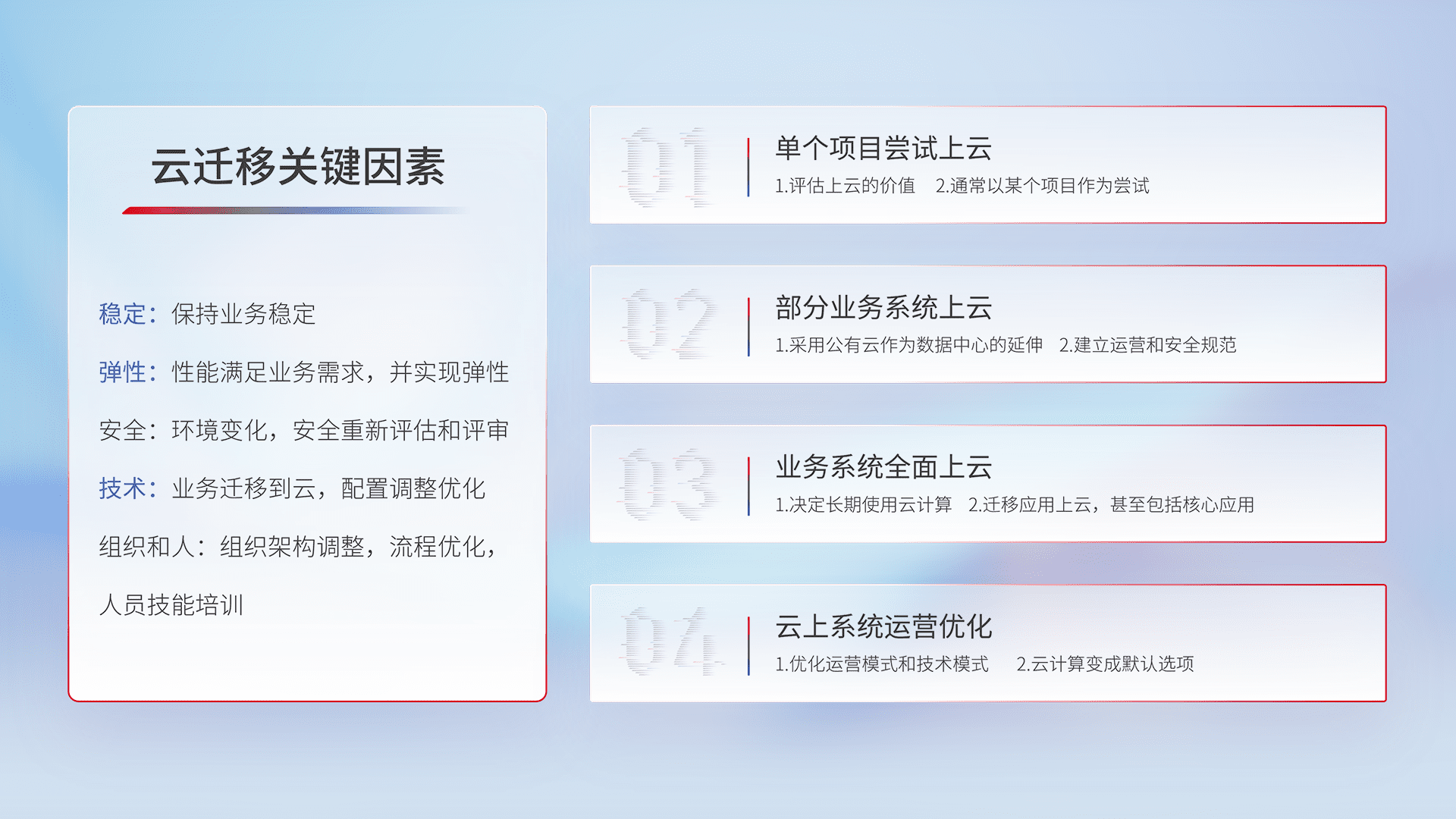 结合实际业务,,,,从规划设计、、云平台选型、、云原生改造、、、数据迁移、、、、集成交付,,,,迁移全过程为客户识别最佳上云路径,,,做好风险识别管理,,,,设计网络架构、、、身份权限、、安全审计合规、、、操作审计、、、、日志审计、、、监控告警策略、、、多站点容灾设计等,,,,对云上基础设施进行整体规划,,,提升IT治理水平,,,以满足弹性、、、高可用、、、、高性能的需求。。。。