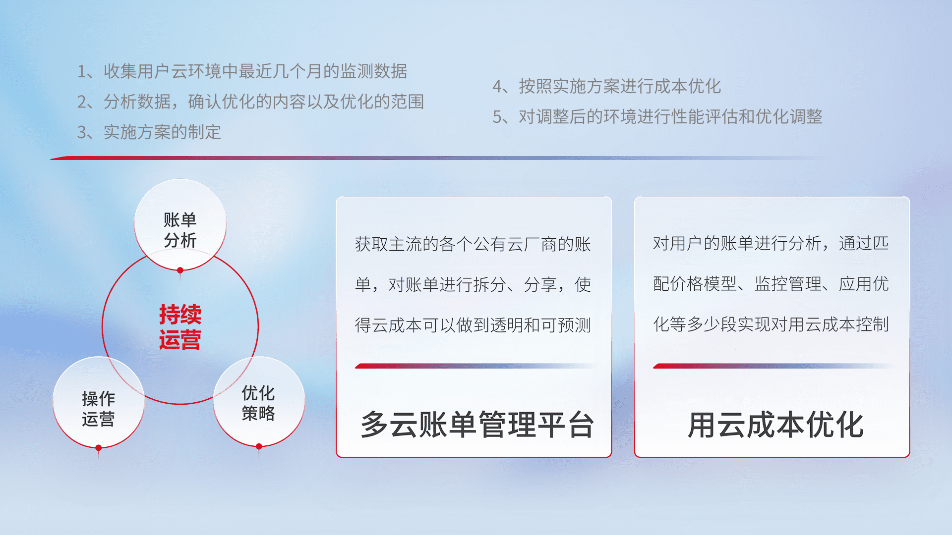 通过多云纳管,,,,以统一的资源数据模型把客户的云资源进行抽象和封装,,进而实现对多云资源的统一操作,,,,保障云资源管理的可靠性、、、稳定性与可用性。。。。量身定制化运维内容,,,,配置、、开发运维、、、、补丁管理、、、备份、、、监控、、、认证和访问管理、、、、审计和日常巡检等,,,保障在用云过程中的可靠度,,稳定度以及高可用率。。。