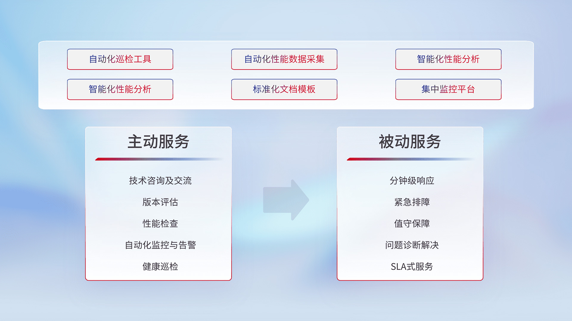 智能化工具和标准化文档,,保障服务质量,,,,提供主动服务(包含技术咨询、、版本评估、、、、性能检查、、、、自动化监控与告警、、、、健康巡检)和被动服务包含(分钟级响应、、紧急排障、、值守保障、、、问题诊断解决、、SLA服务)。。。。